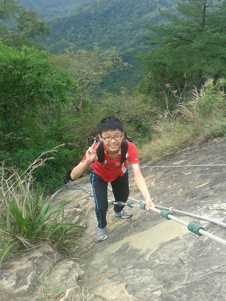 在國二,我們班去爬五寮尖,面對三十公尺的峭壁,班上同學勇往直前,手握繩子,在家長的引導下遵照「三點不動,一點動」的口訣,一步步跨過岩山。